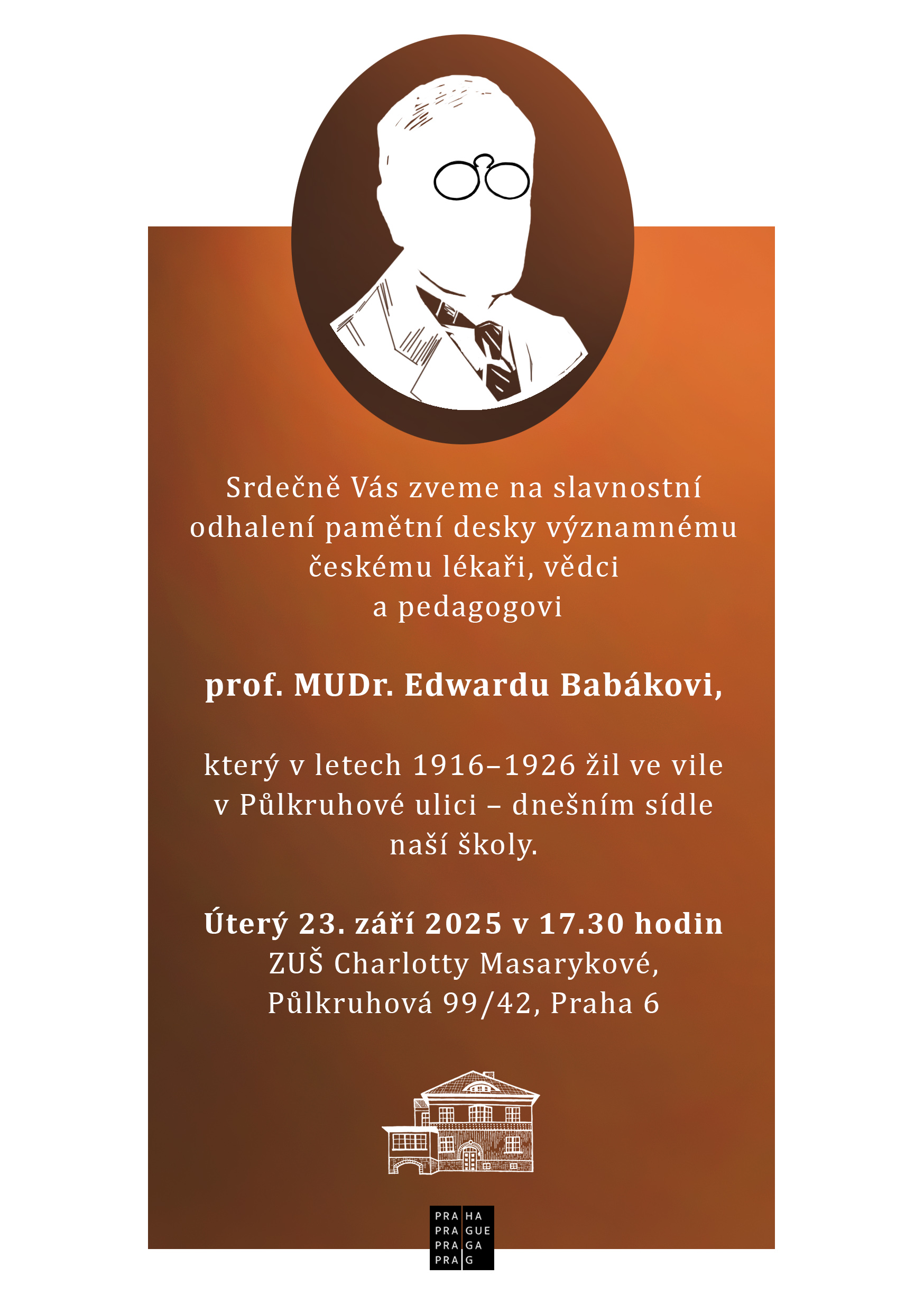 V úterý 23. září 2025 bude slavnostně odhalena pamětní deska věnovaná významnému českému lékaři, vědci a pedagogovi, prof. MUDr. Edwardu Babákovi, který v letech 1916-1926 žil ve vile, která dnes slouží jako sídlo naší ZUŠ.